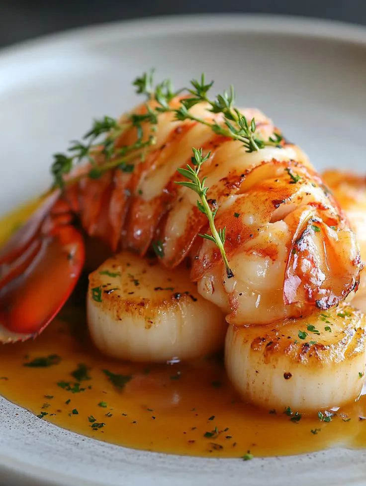 Vieiras salteadas, langosta a la plancha, camarones al ajillo