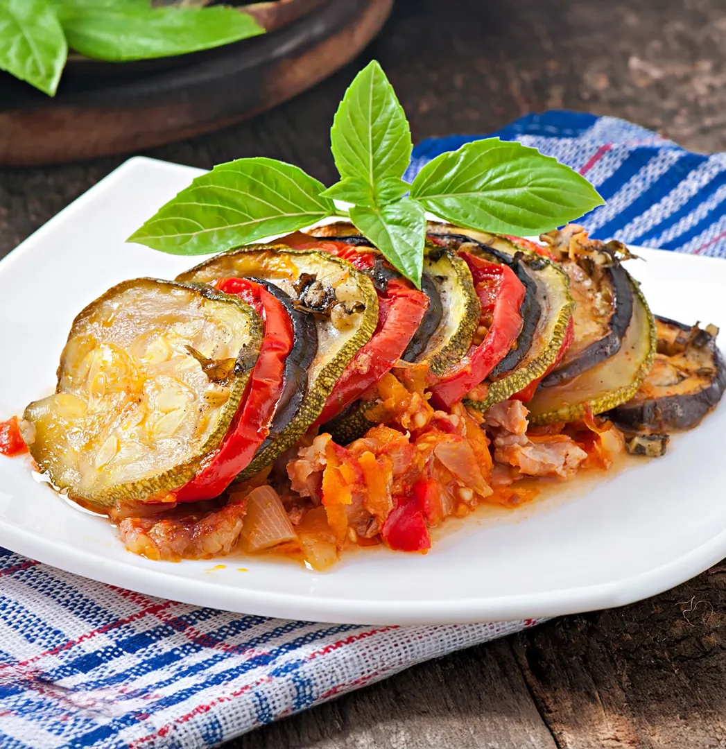 Como Ratatouille, estofado de verduras, berenjena asada, setas salteadas.